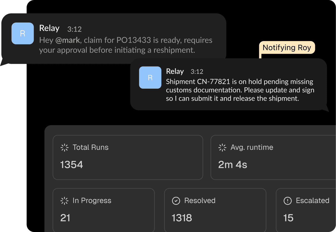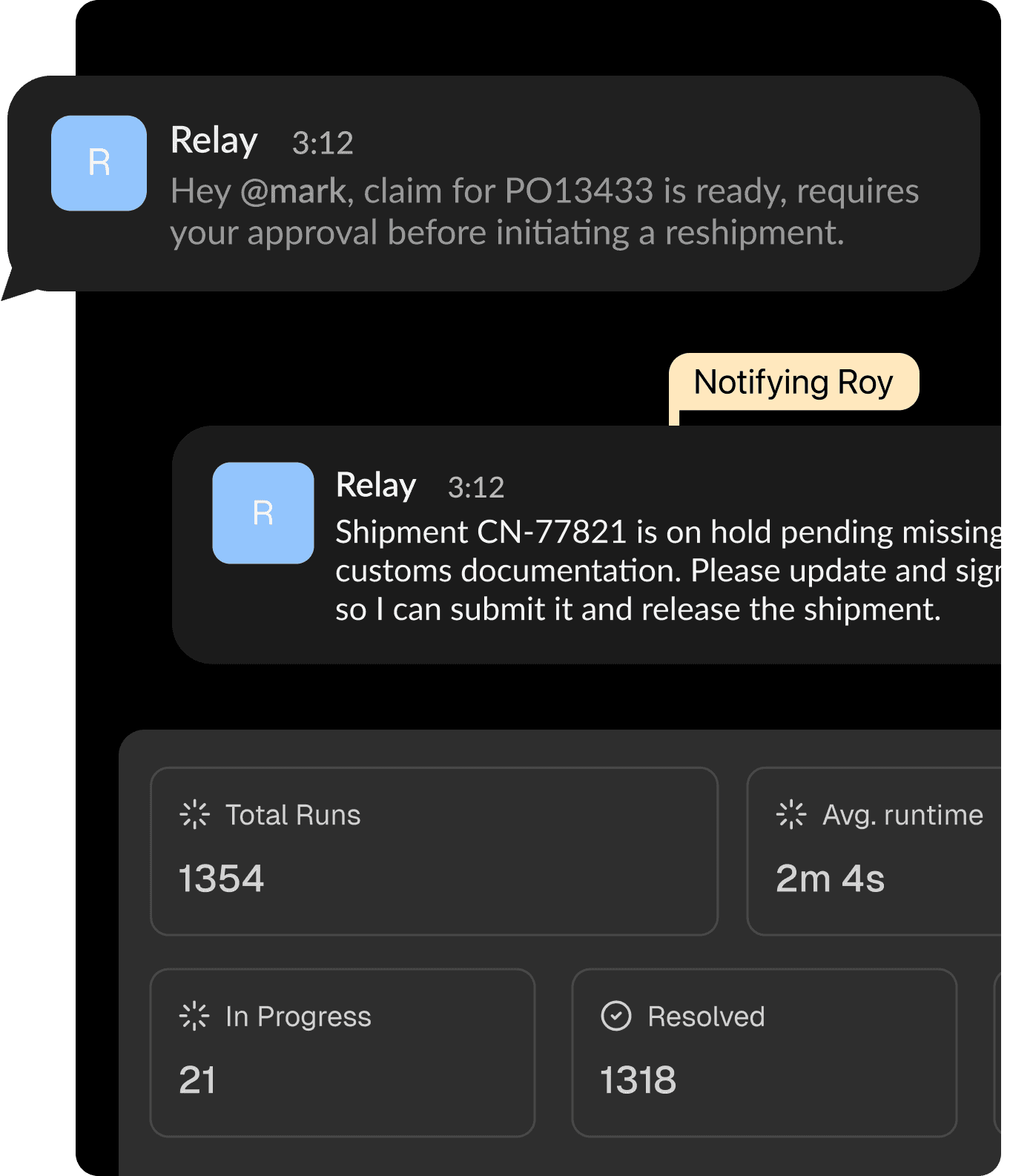 Relay was designed to remove dependency on tribal knowledge and manual coordination. It turns expertise embedded in people’s heads into structured, always-on execution across systems and external partners. Rather than chasing updates or coordinating vendors by hand, Relay runs the process end to end and escalates only when necessary. The result is resilient operations that scale without adding operational overhead.