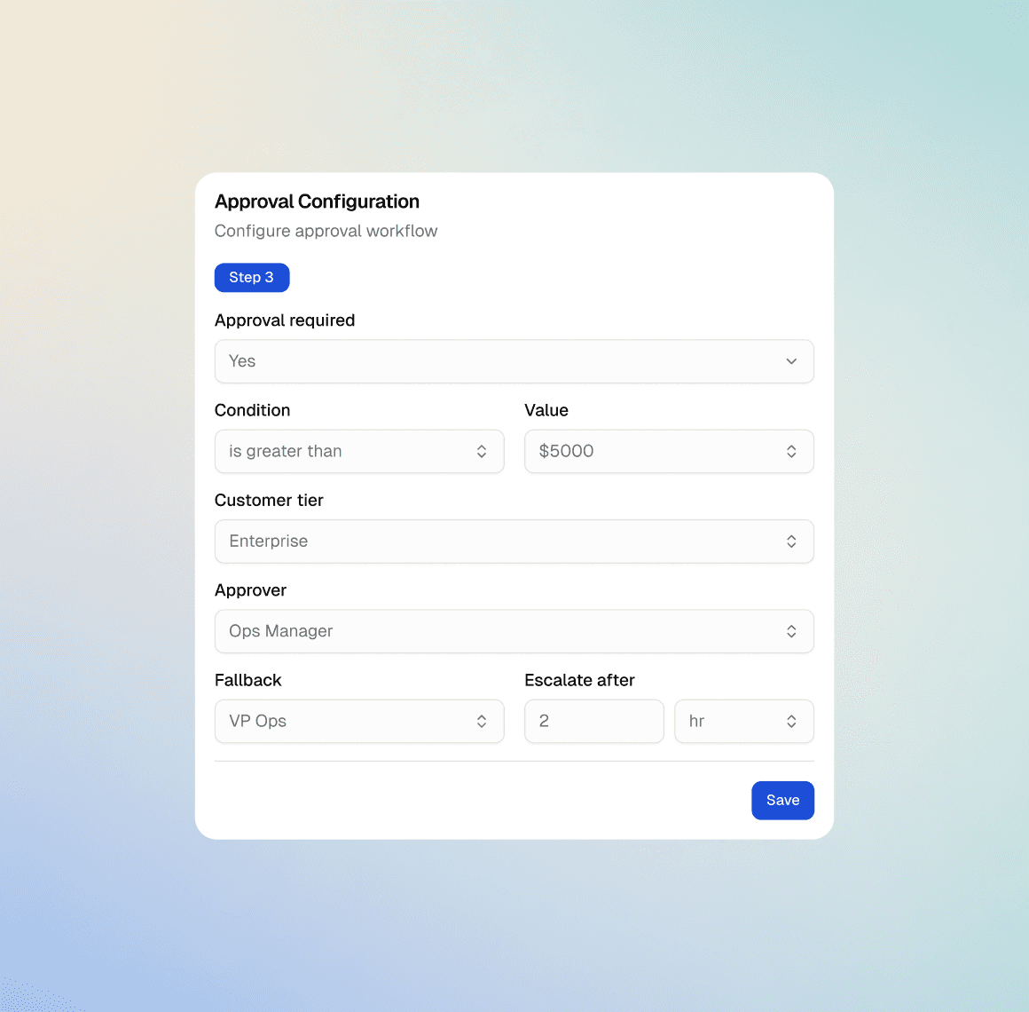 Set rules for what Relay can do on its own and what requires a human sign-off. Approval gates can be based on dollar thresholds, issue severity, customer tier, or any condition your operations require.