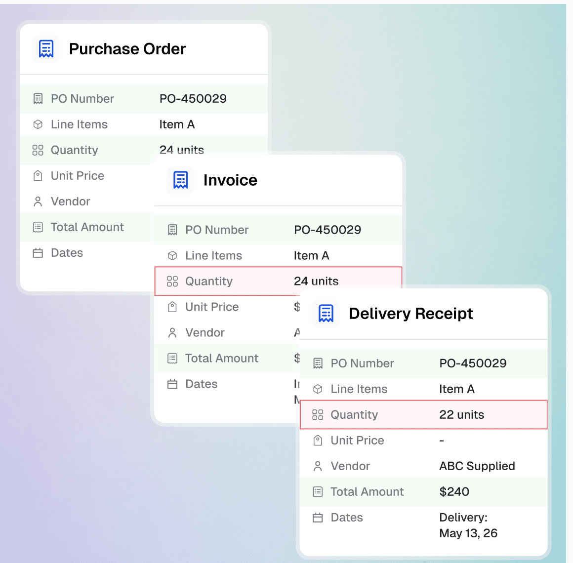 Cross-reference invoice data against POs and delivery receipts automatically.